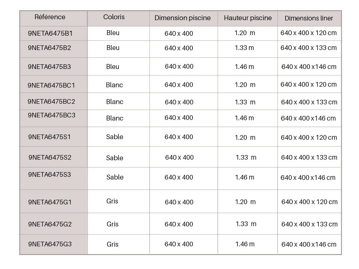 Le liner est fabriqué sur mesure et il est uniquement adapté pour les piscines bois de la marque Cerland de 640 x 400 m et avec une hauteur de 1.20 m, 1.33 m ou 146 cm uniquement.