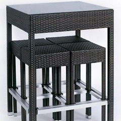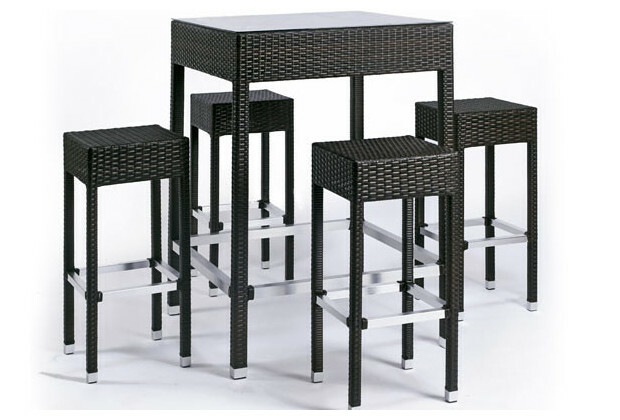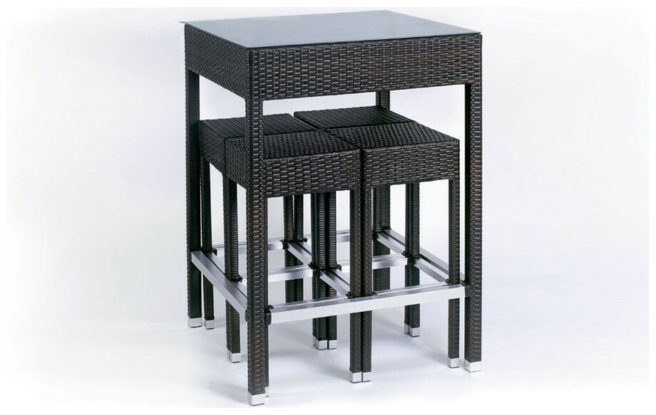 Les reposes pieds de la table, des tabourets ainsi que ses empiétements donnent un style très moderne à cet ensemble de jardin.
