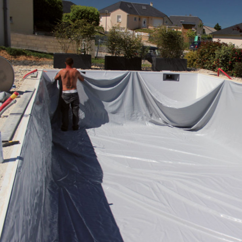 Pose d'un feutre de protection et d'un liner PVC pour l'étanchéité.