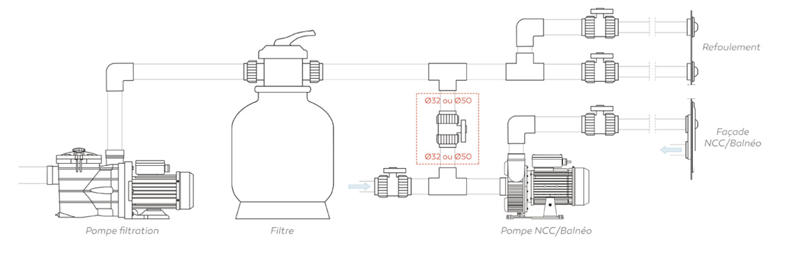 Associe la pompe à une façade avec réglage air/eau : cela permet d'adapter le débit et la puissance en fonction de l'utilisateur (nage sportive, détente, massage).