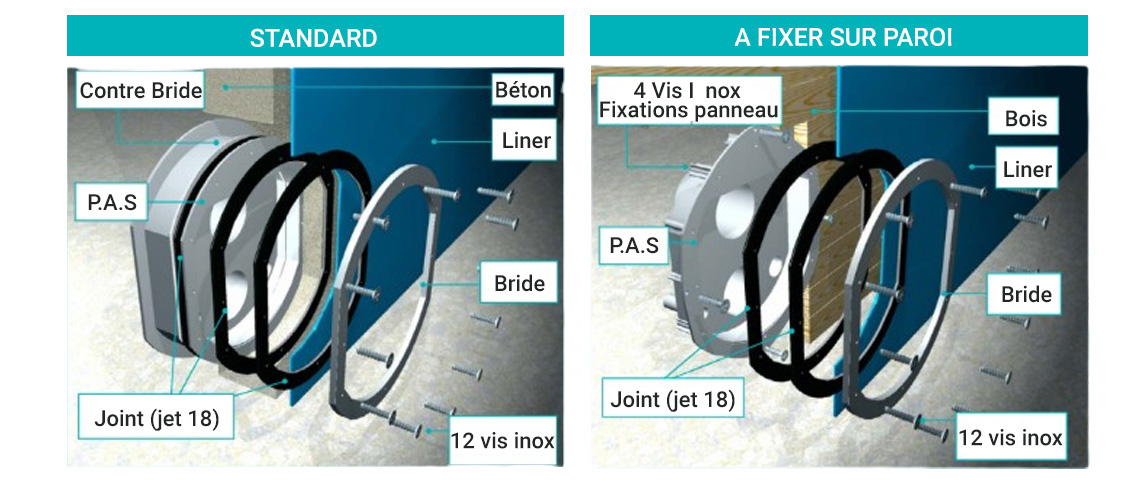 Grâce à son système simple et universel, elle s'intègre à toutes les structures de piscines avec 2 choix de pièces à sceller (P.A.S.) :