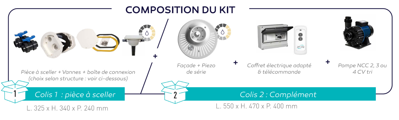 Important : commandez d'abord la pièce à sceller selon la structure de votre piscine (Colis 1), puis le complément la puissance et le coloris (Colis 2).