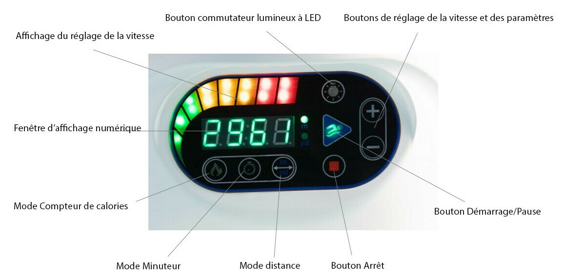 Panneau de commande digital est simple à utiliser et affiche les données relatives à votre nage à contre courant.