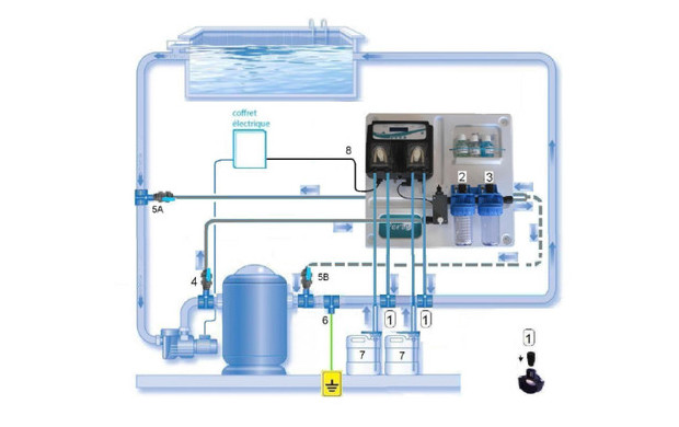 5a- Point de retour (une chambre d'analyse est recommandée). Raccordement sur la canalisation d'aspiration de la pompe de filtration, pour une circulation de l'eau optimisée