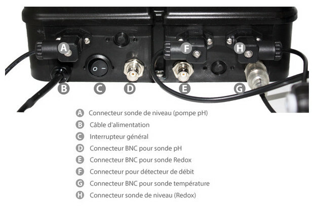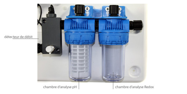 Le panneau est composé d'un boitier avec deux pompes péristaltiques (chargées chacune du dosage du pH et du chlore), de deux chambres d'analyse (l'une pour le pH, l'autre pour le redox), d'une sonde de température et d'un détecteur de débit.