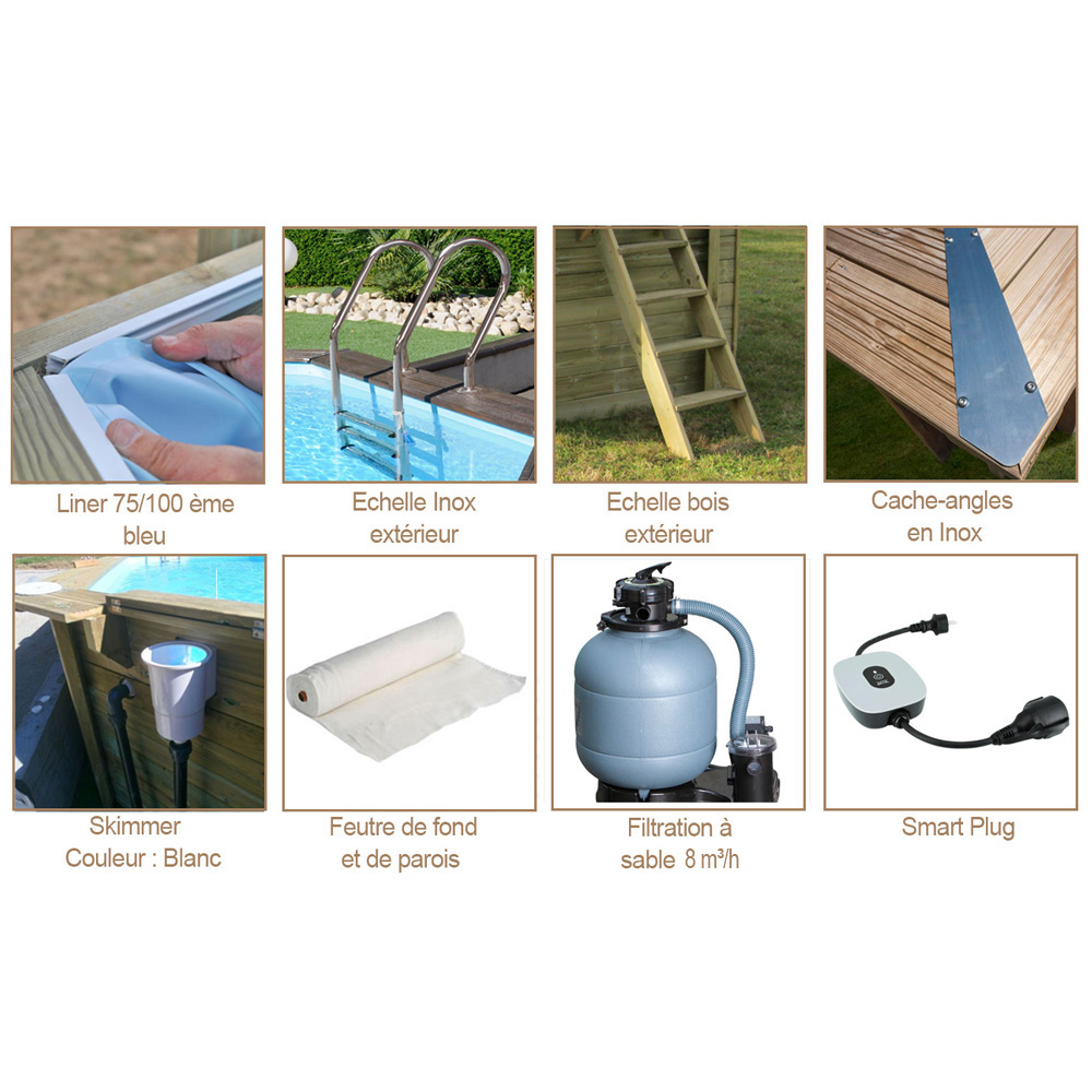 La piscine en bois Avocado GRE, fabriquée en France, est livrée en kit complet prêt à plonger pour une installation rapide en quelques heures grâce à son système languette/rainure. Tous les équipements inclus sont choisis pour leur qualité et facilité d'installation.