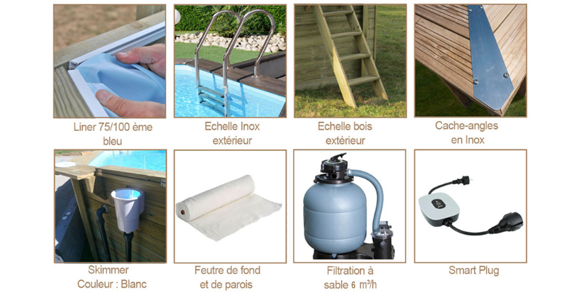 Structure : parois et margelles en pin traité autoclave classe IV, imputrescible