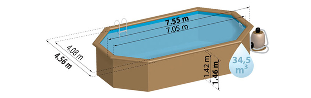 Caractéristiques - Piscine bois Orange 7.55 m x 4.56 m x H.1.46 m