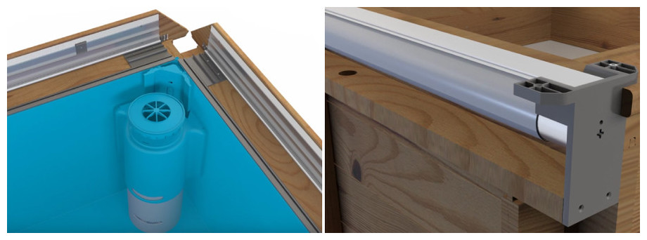 - La bâche de sécurité est intégrée dans l'une des margelles dans laquelle vient se loger un enrouleur.