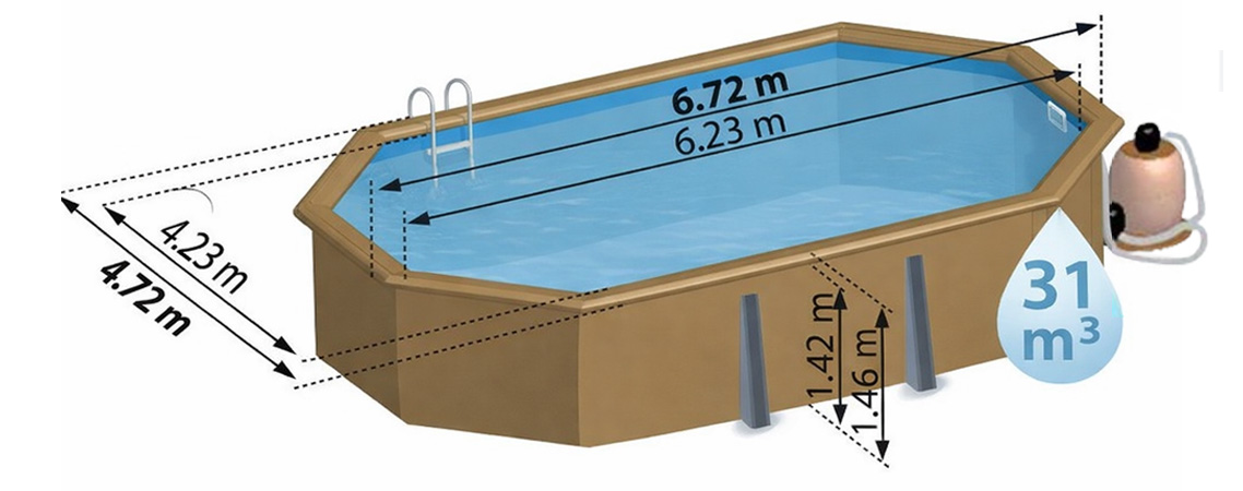 Caractéristiques - Piscine bois Vermela 6.72 m x 4.72 m x H.1.46 m