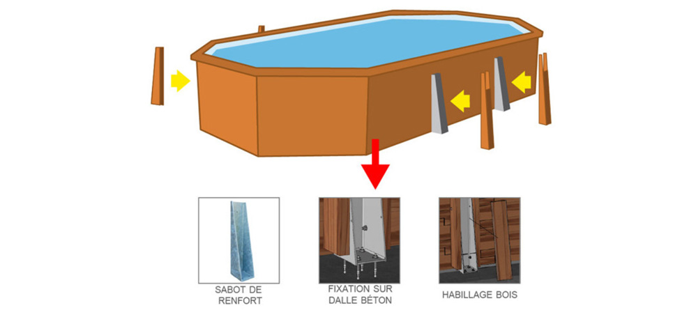 - Pour améliorer la solidité du bassin, des sabots métalliques sont intégrés à la structure : ils se fixent sur une dalle en béton fibré. Ainsi, vous pouvez envisager de couler la dalle avec une épaisseur minimale de 17 cm avant d'installer le bassin.