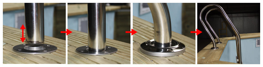 L'innovation qui facilite la vie : l'échelle intérieure n'est pas fixée à la margelle ; elle s'insère dans des patterns d'ancrage en inox, eux même vissés sur la margelle, et peut ainsi se retirer à n'importe quel moment, sans avoir à sortir sa boîte à outils !