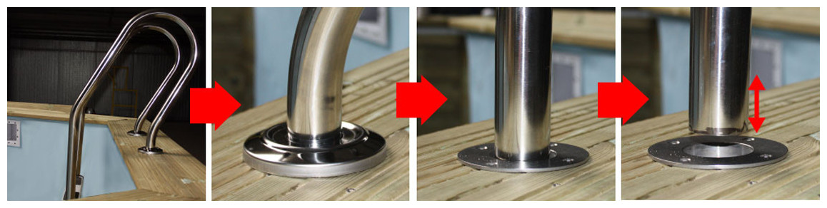 L'innovation qui facilite la vie : l'échelle intérieure n'est pas fixée à la margelle ; elle s'insère dans des paterns d'ancrage en inox, eux même vissés sur la margelle, et peut ainsi se retirer à n'importe quel moment, sans avoir à sortir sa boîte à outils !