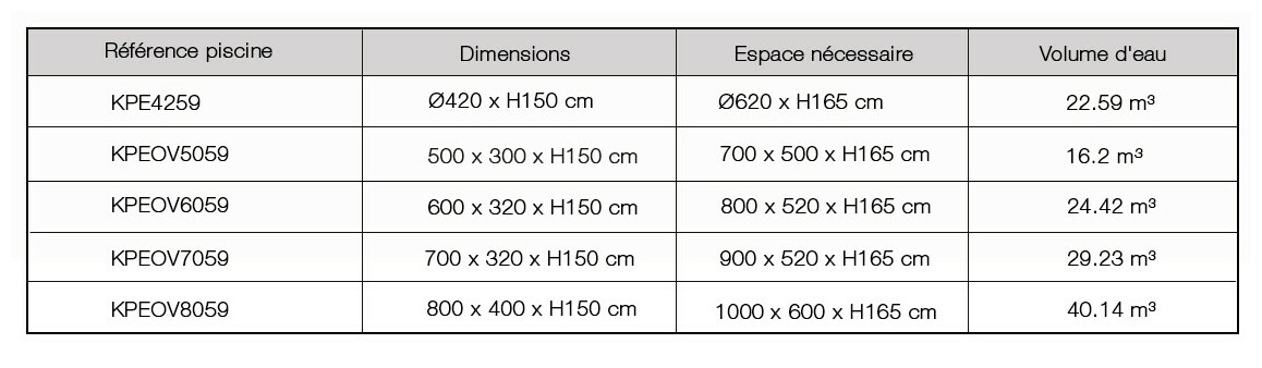 Cinq modèles vous sont proposés en hauteur 150 cm : un bassin rond et 4 bassins ovales, parmi lesquels vous trouverez celui qui s’intégrera le mieux dans votre terrain.