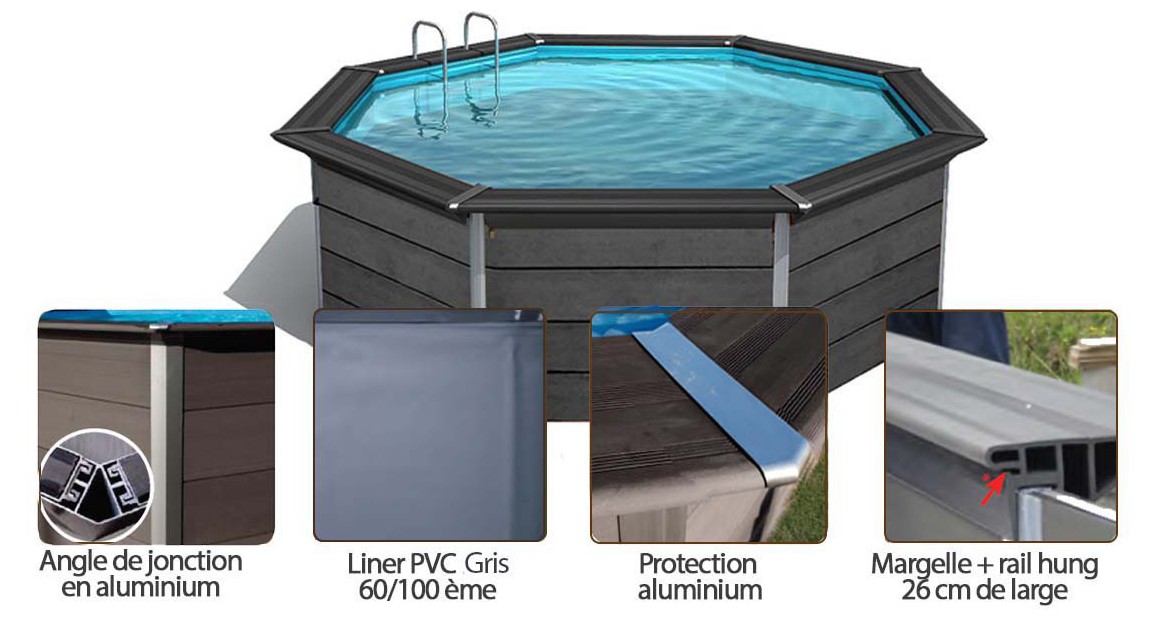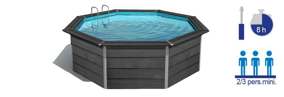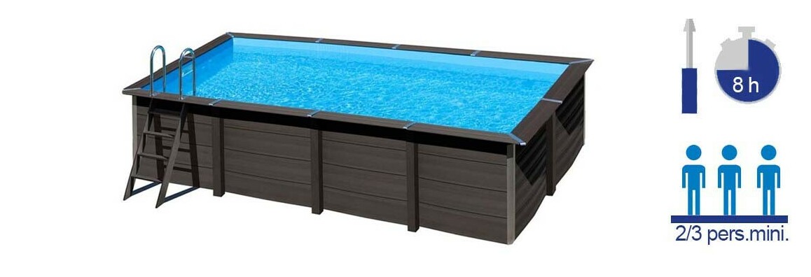 Résistante et pérenne, sa structure allie le bois et la résine pour un rendu esthétique et durable ! En kit, facile à monter, elle comprend tout l'équipement nécessaire pour sa bonne mise en place et son bon fonctionnement (revêtement liner, échelles, filtration, pièces à sceller).
