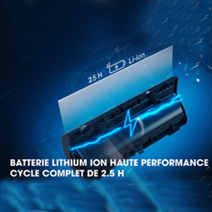 Autonomie longue durée : Jusqu'à 2 h 30 min avec batterie lithium-ion rechargeable rapidement.