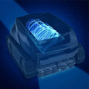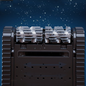 - Trois moteurs coordonnés : chaque moteur agit en synergie avec les brosses hélicoïdales afin d'optimiser la vitesse et la puissance sur le fond, les parois et la ligne d'eau, garantissant un nettoyage complet, homogène et une performance constante pendant tout le cycle.