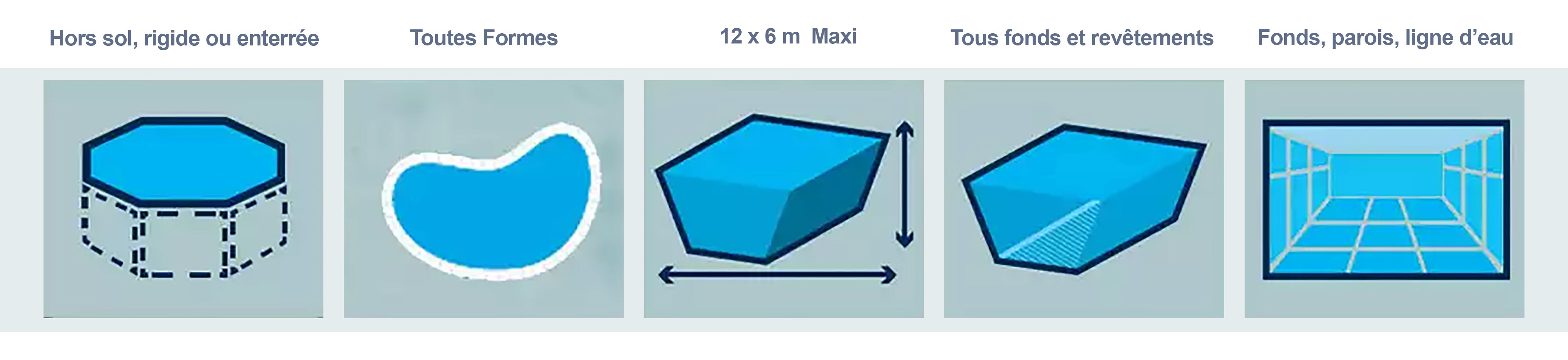 Adaptées à tous types de revêtements : liner, PVC armé, polyester, carrelage