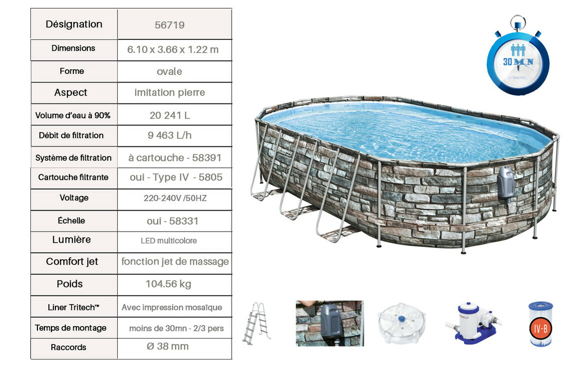 Piscine tubulaire ovale Power Steel 6.10 x 3.66 x H.1.22 - Comfort jet - Motif pierre