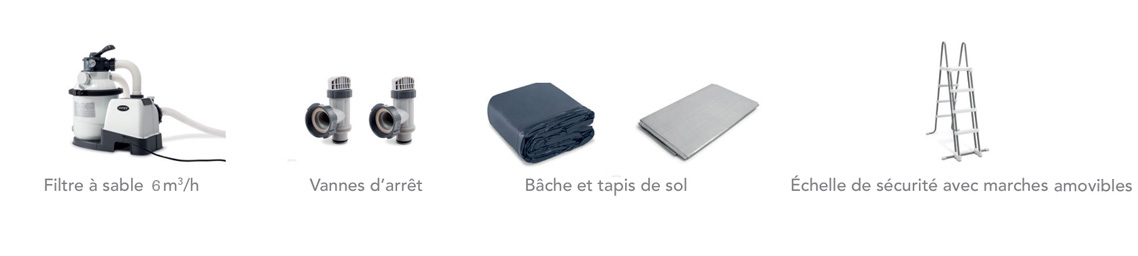 La piscine Graphite et ses accessoires assortis. Pour votre confort et votre satisfaction, de nombreux équipements sont inclus dans le kit :