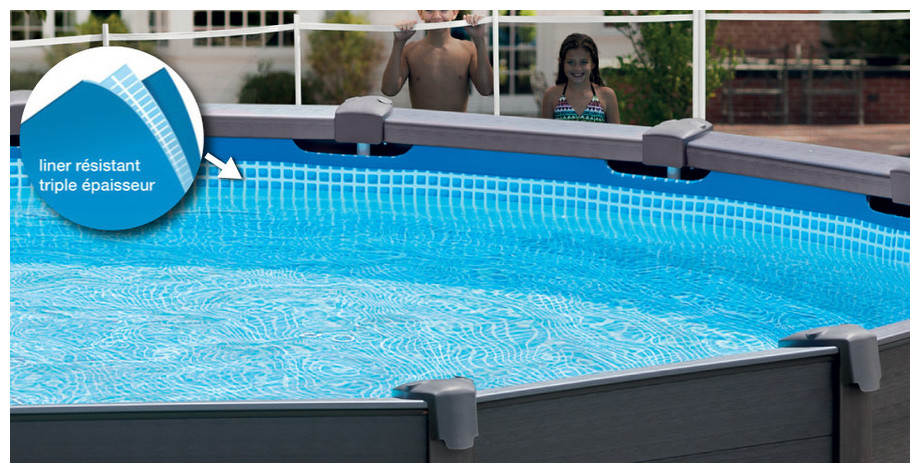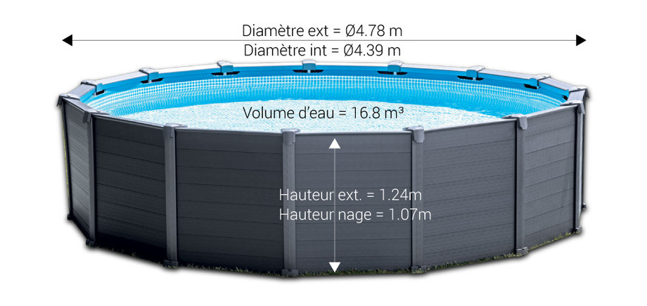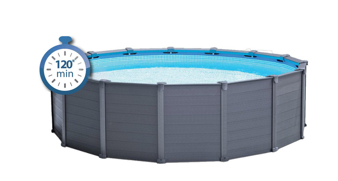Profitez du design élégant de la piscine Intex Graphite avec habillage PVC, qui s'intègre parfaitement dans votre jardin ! (120 minutes), la piscine hors-sol Graphite mesure Ø4.78 x 1.24 m, et offre une belle surface de nage. Elle est livrée avec tout son équipement complet : son filtre à sable (4 m³/h), son échelle sécurité avec marches amovibles, sa bâche et son tapis de sol.