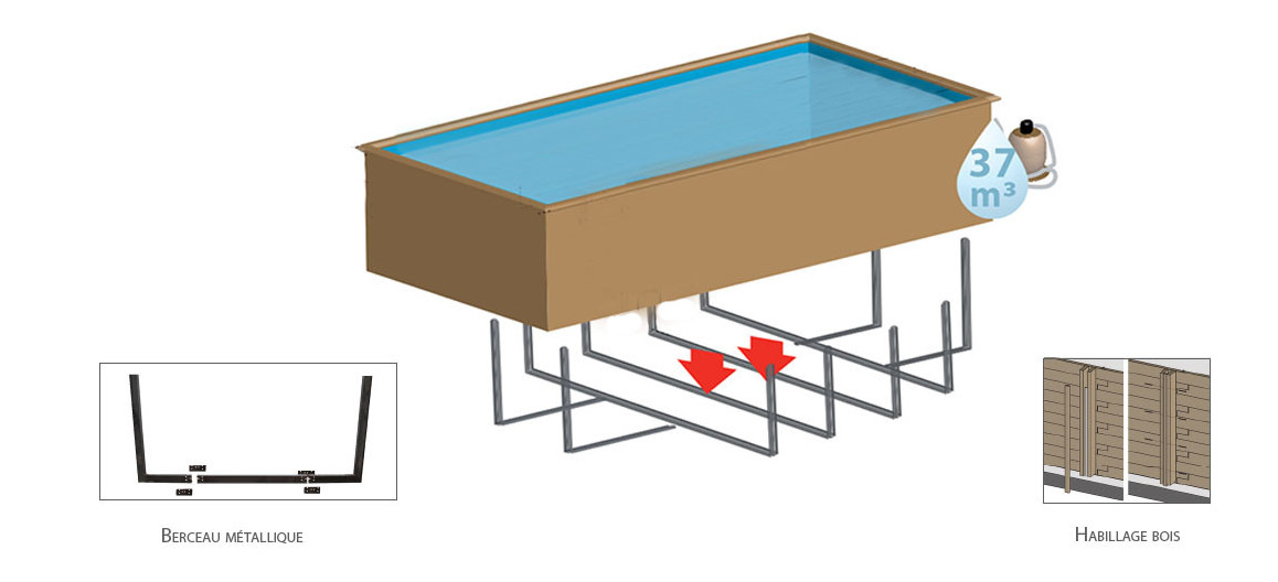 Votre piscine rectangulaire 815x420 est renforcée par 6 berceaux métalliques, à sceller dans la dalle, avec revêtement bois.