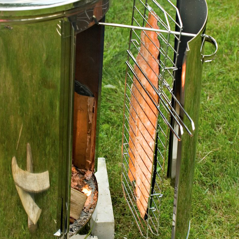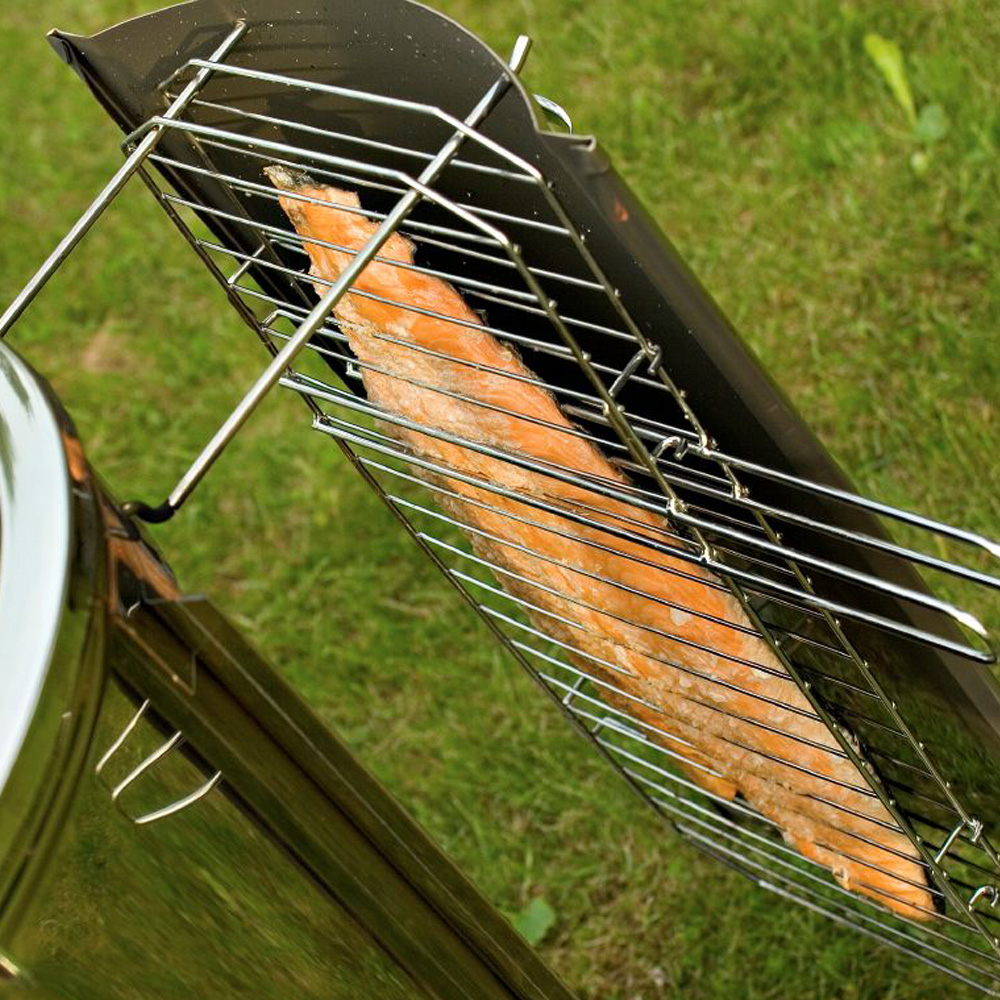 - Utilisation : Griller, fumer, frire, pocher - Dimensions : Ø 420 mm, hauteur 700 mm - Poids : 17 kg - Alimentation : Bois - Matériaux : Inox - Inclus : 2 grilles rondes plaquées chrome - Accessoires : Unité de transfert de chaleur, séparateur de graisses, grilles pour aliments fumés ou grillés avec supports