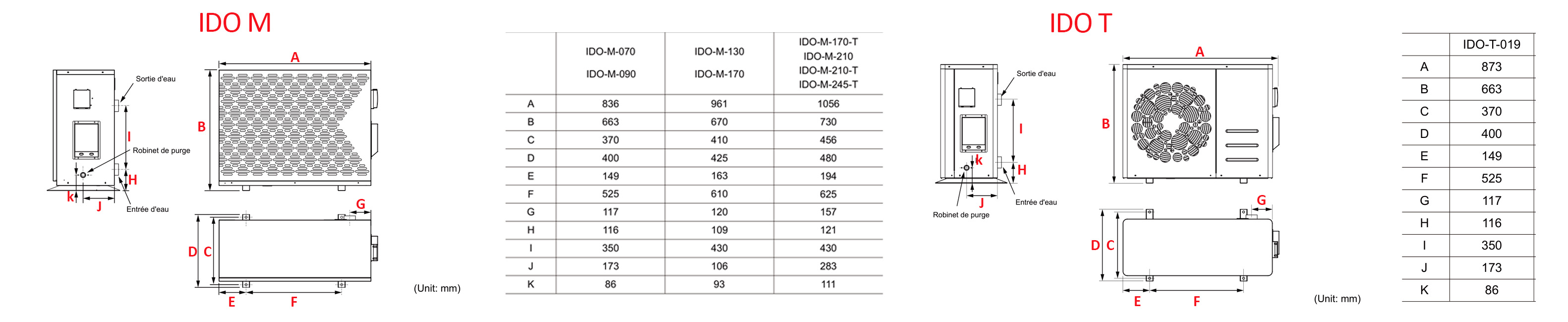 Caractéristiques | IDO M - 070 | IDO M - 090 | IDO M -170 | IDO M - 170 TRI | IDO T - 190 | IDO M - 210 | IDO M - 210 TRI | IDO M - 250 TRI |