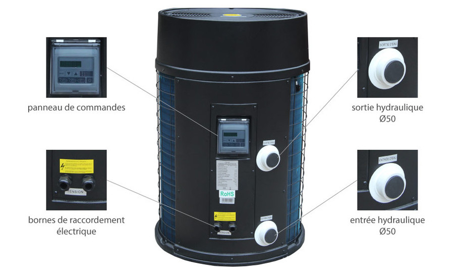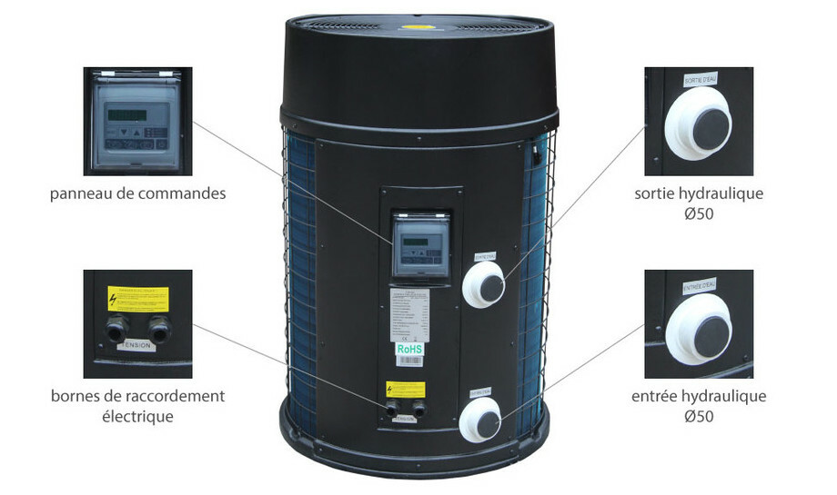 Echangeur : en titane spiralé, il assure un excellent rendement thermique, et une grande résistance à l'usure et à la corrosion, ce qui le rend compatible avec les piscines équipées d'électrolyseurs.