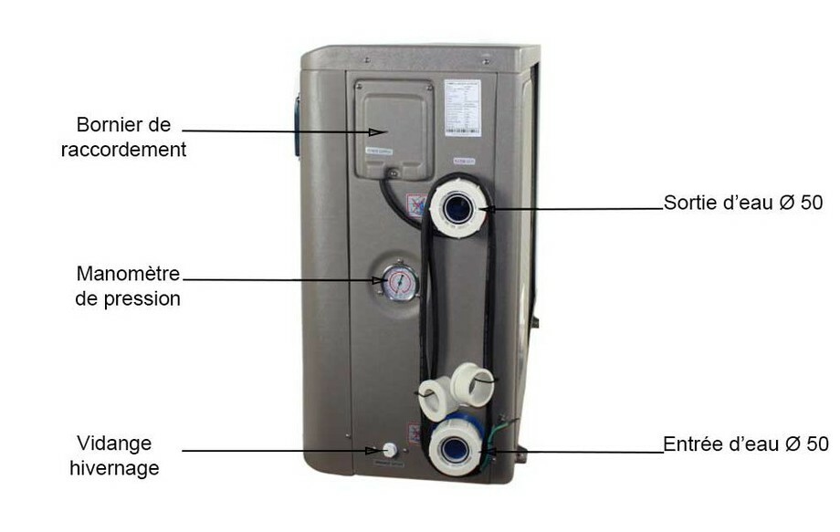- Hivernage : vidange d'hivernage accessible par l'extérieur et housse de protection incluse, avec grille sur face arrière et emplacement pour les raccord latéraux.