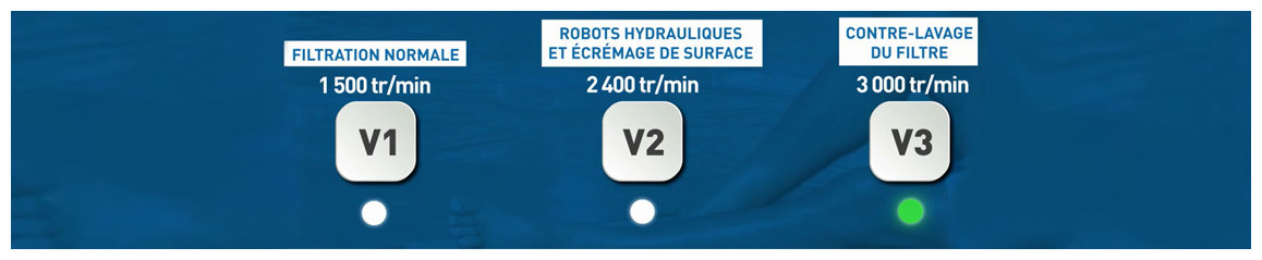 2) Haute vitesse de filtration : pour rattraper une eau ayant tourné ou pour faire fonctionner un robot aspirateur