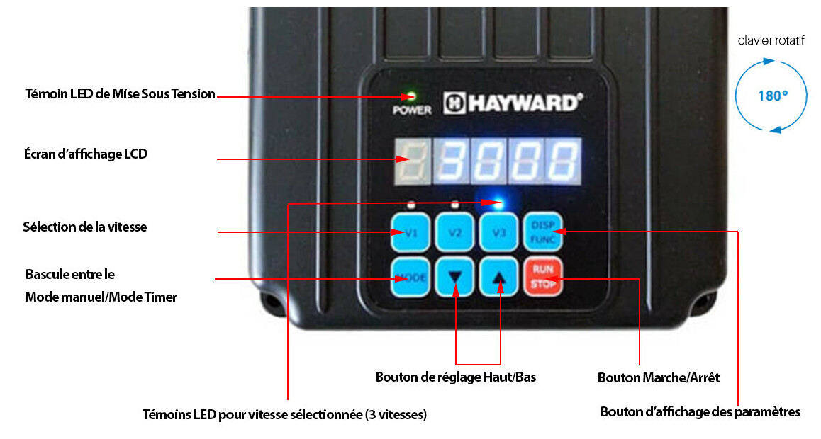 Facile et intuitif, le boîtier de commande de la Super Pump® VSTD possède un clavier rotatif à 180° et permet un accès aux informations et à un contrôle intuitif de ses 3 vitesses :