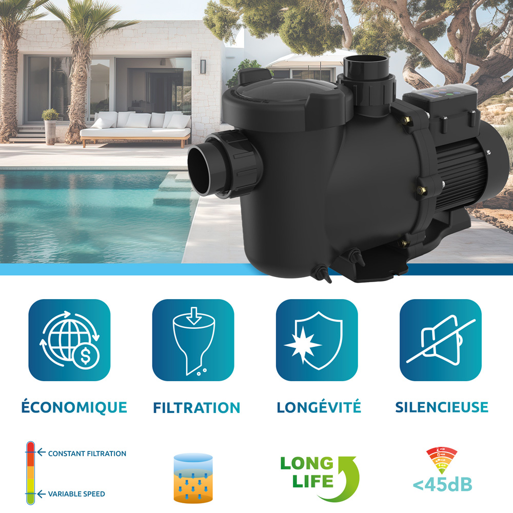 - Discrétion absolue : À vitesse réduite, la pompe émet jusqu'à 4 fois moins de bruit qu'une pompe à vitesse constante, garantissant un fonctionnement silencieux et un confort optimal.
