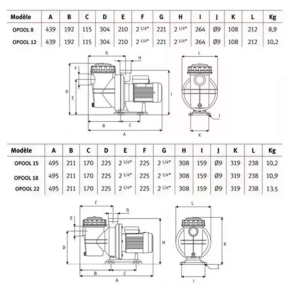 Fabriquées en Espagne, les pompes de filtration O'Pool de 8 m³/h à 22 m³/h sont idéales pour maintenir une eau propre, que vous ayez une petite piscine résidentielle ou une grande piscine commerciale. Faites confiance à la qualité et à la performance des pompes O'Pool pour profiter pleinement de votre piscine toute l'année. - monophasée - Silencieuse - Compacte : Encombrement réduit - Auto-amorçante 4 mètres - Compatible eau salée (jusqu'à 7 g/litre) - Garantie 4 ans