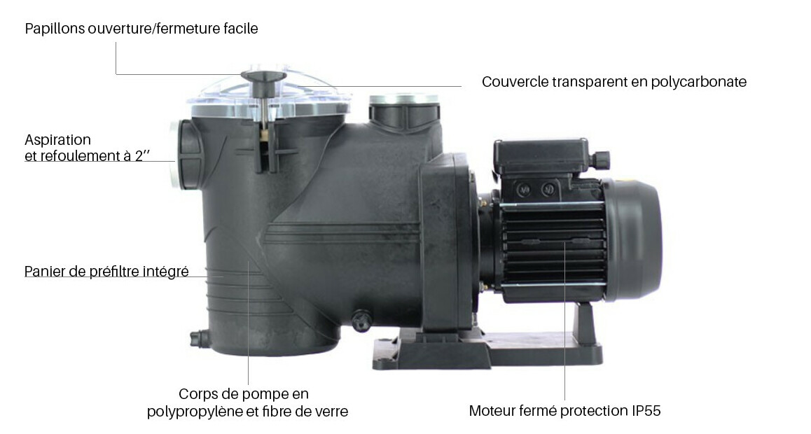 Ses caractéristiques en font une pompe qui filtre idéalement l'eau de votre piscine.