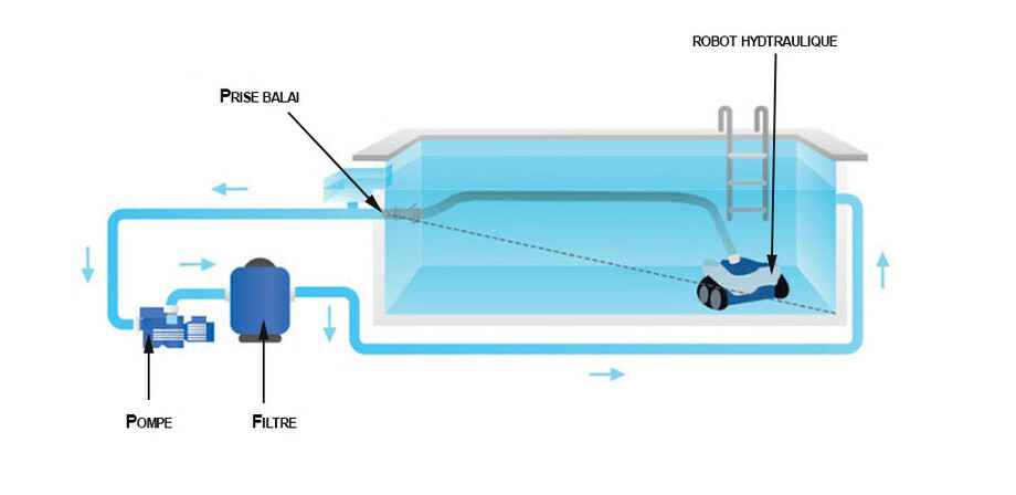 - Le robot ou le balai aspire l'eau dans la tuyauterie par le biais de la prise balai. Les saletés seront retirées par le filtre, l'eau est ensuite renvoyée dans la piscine à travers les buses de refoulement.