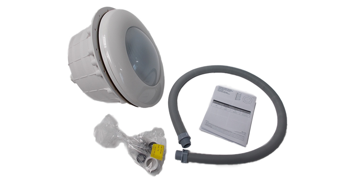 Livré complet avec niche et led, bride, enjoliveur blanc, joints d'étanchéité, câble et visserie.