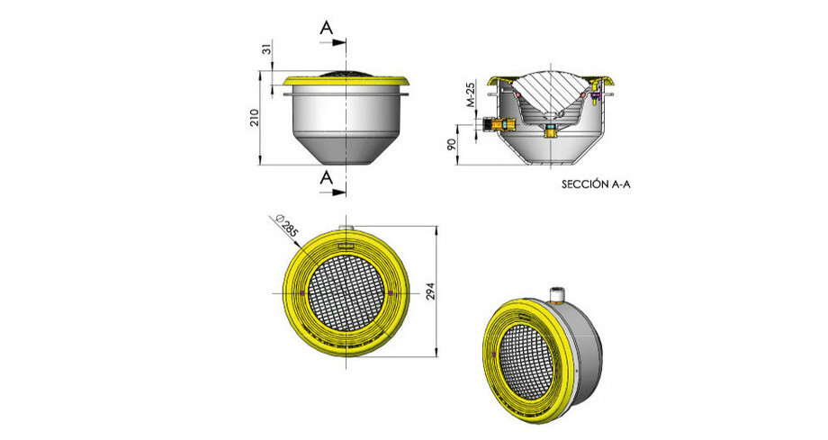 - Niche de lampe : Polypropylène avec presse étoupe à vis M25 et gaine de passage de câble.