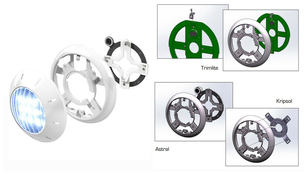 - L'option CLIP, vendue séparément, permet de replacer les projecteurs de certains fabricants : Astralpool, Poolrite et Kripsol.