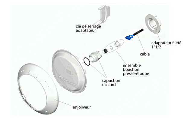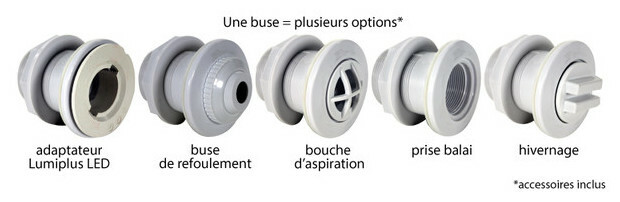 Lumiplus fait preuve d'une grande flexibilité d'utilisation, et se raccorde à la buse de refoulement livrée avec le projecteur (Ne concerne pas la buse de refoulement livrée avec la piscine).