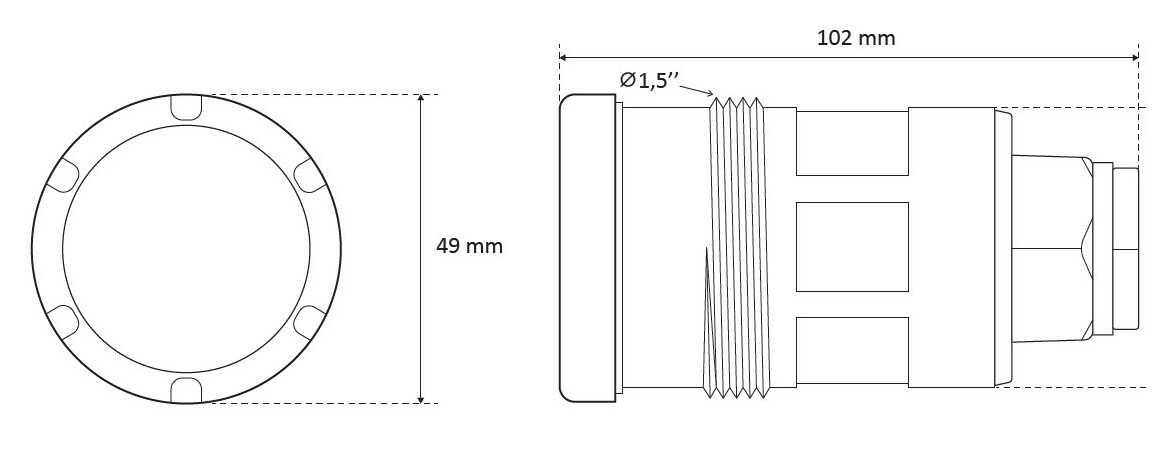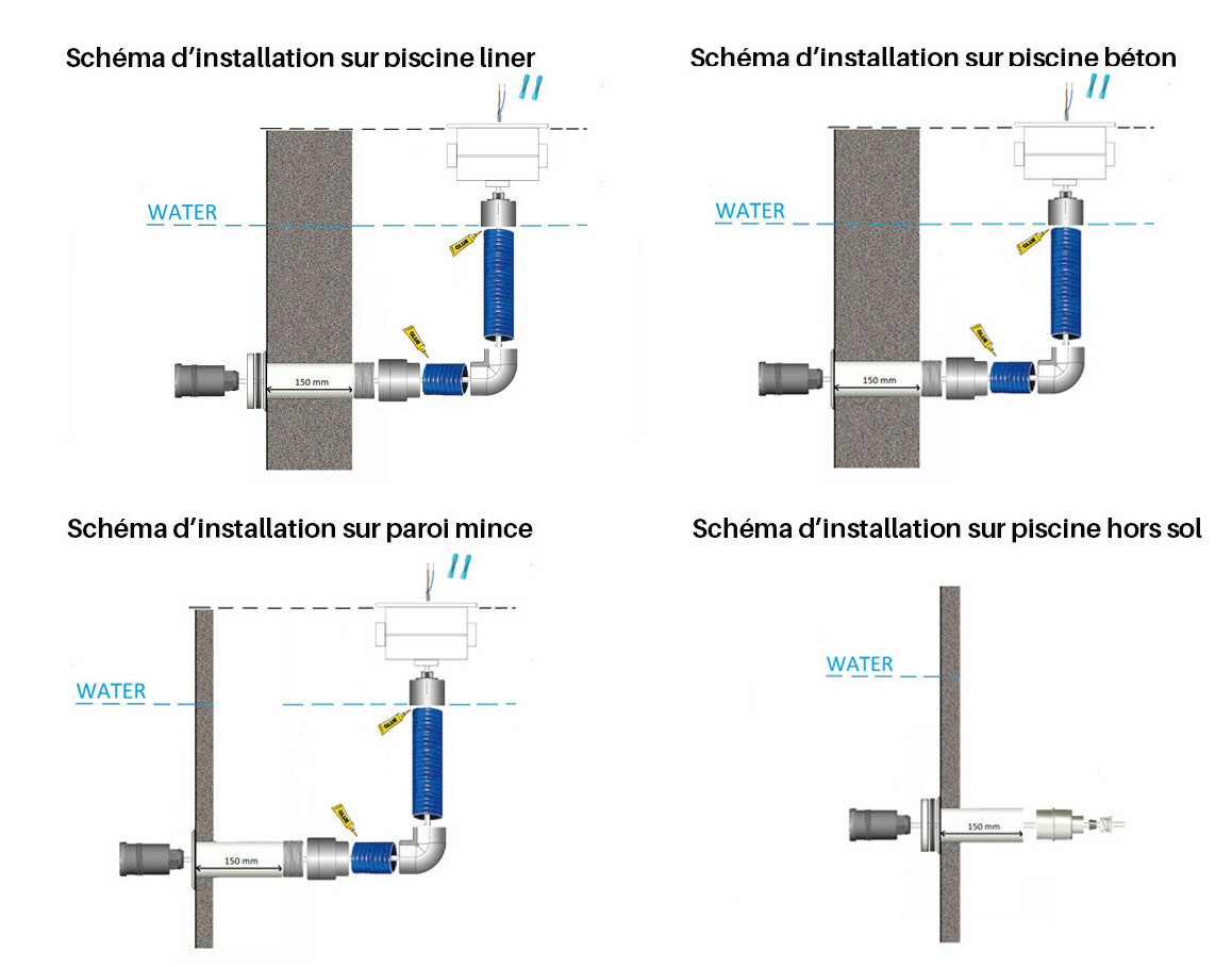 - Ce projecteur tubulaire est facile à installer. Il est recommandé de prévoir une traversée de paroi dans lequel une prise balai ou une buse de refoulement de 1,5" est insérée afin d'y visser le filetage arrière du mini projecteur.