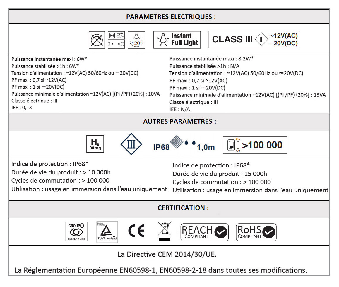 Selon le nouveau règlement européen 874/2012 entré en vigueur en septembre 2013, cet appareil est un appareil sans précédent dans le monde, il permet de mesurer le flux lumineux de l'éclairage dans l'eau pour définir sa nouvelle catégorie d'énergie.