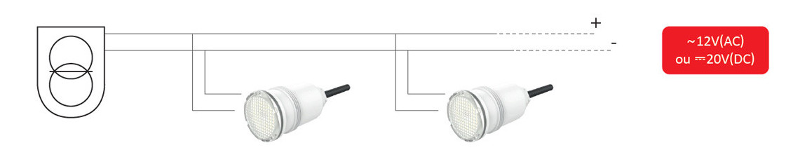 Si vous disposez de plusieurs lampes, Vous pourrez installer un module de commande radio sur l'alimentation entre le projecteur et le transformateur afin de synchroniser vos séquences couleurs (voir module de commande radio de la gamme Seamaid en vente en option sur notre site).