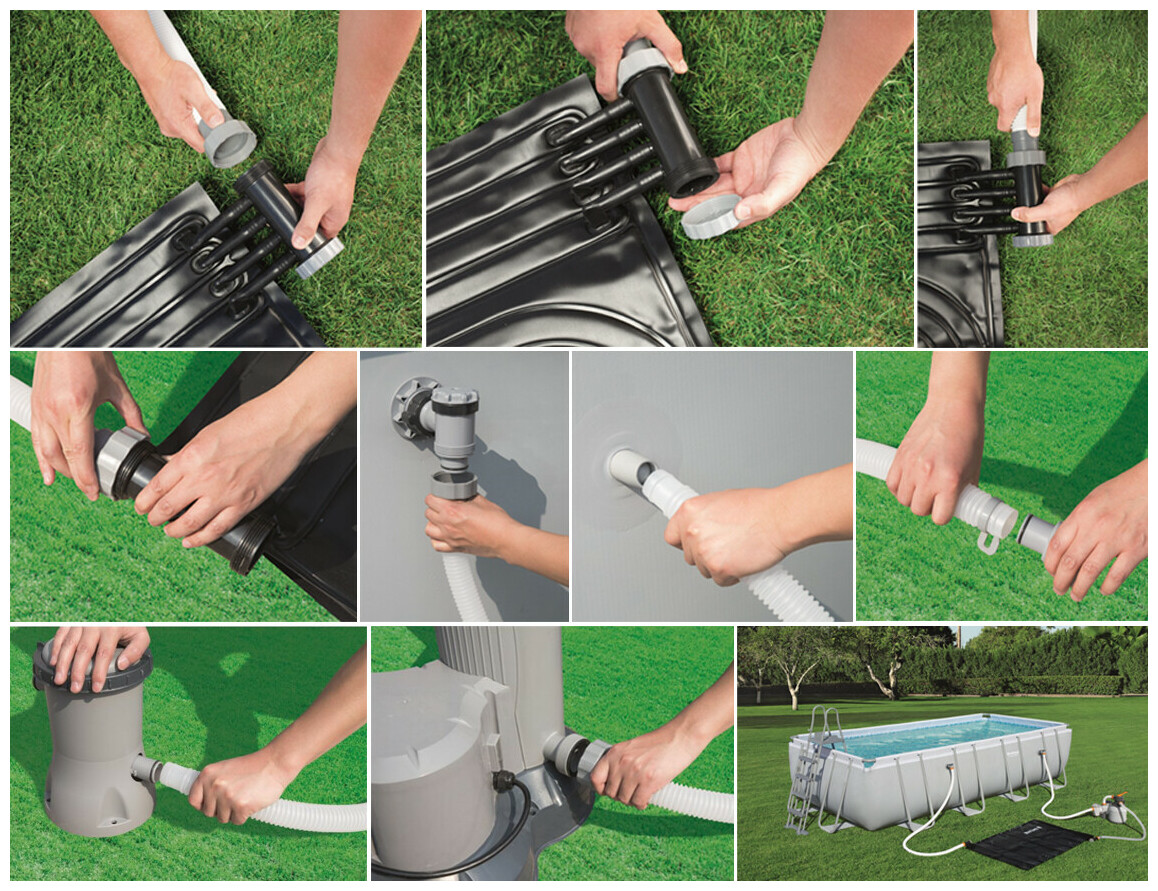 La pompe de filtration de votre piscine pompe l'eau à travers le capteur solaire. Lorsque l'eau arrive dans le réchauffeur par la pompe de filtration et le tuyau, elle est chauffée par le soleil. Ensuite, l'eau chauffée est pompée vers la piscine par le tuyau.