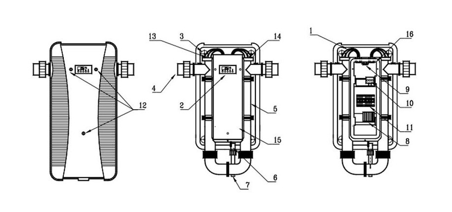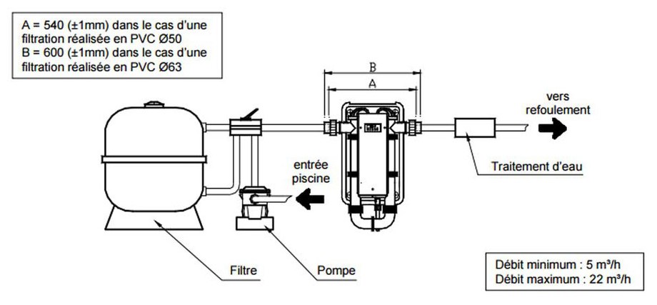 Montage en ligne dans le local technique, après la filtration et avant les apapreils de traitement d'eau.