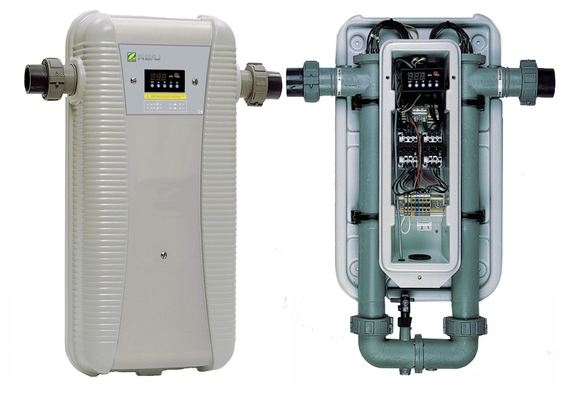 Réchauffeur électrique à circulation en coffret "spécial piscine", pour piscines privées ou publiques, extérieures et intérieures, jusqu'à 160 m³.