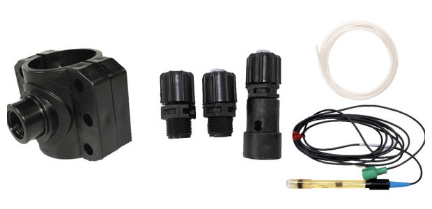 Le régulateur de pH O'clair est livré avec une sonde pH (calibrée en usine) et tous les éléments nécessaires à l'installation (réducteurs, colliers de prise en charge, etc.)