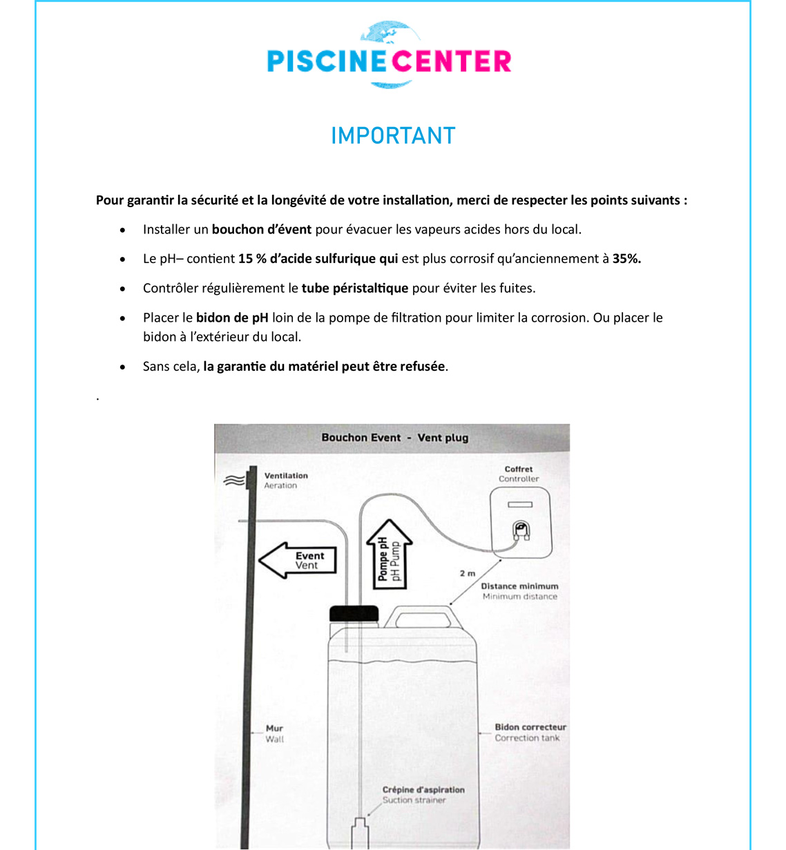 Une fois intégré à votre circuit de filtration et programmé, il gère et corrige le pH de l'eau, et représente une économie importante de temps et de moyens.