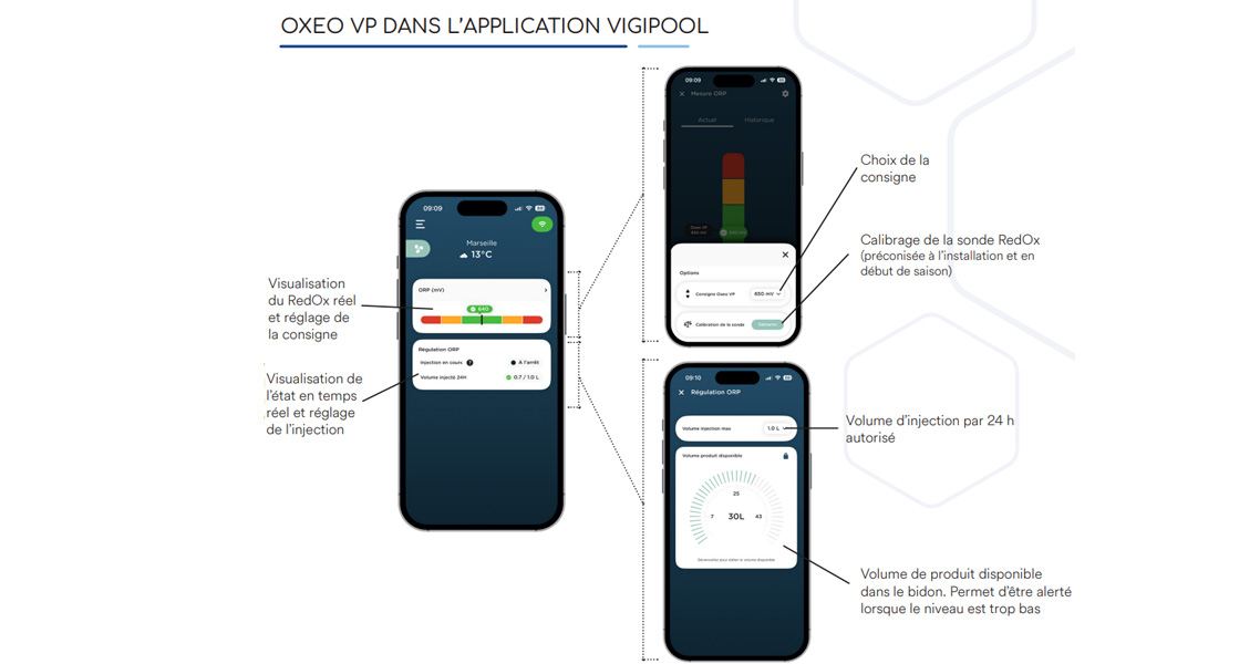 Le Oxeo VP POD se connecte à l'application Vigipool, vous permettant de piloter votre piscine à distance et de centraliser tous vos équipements depuis votre smartphone.