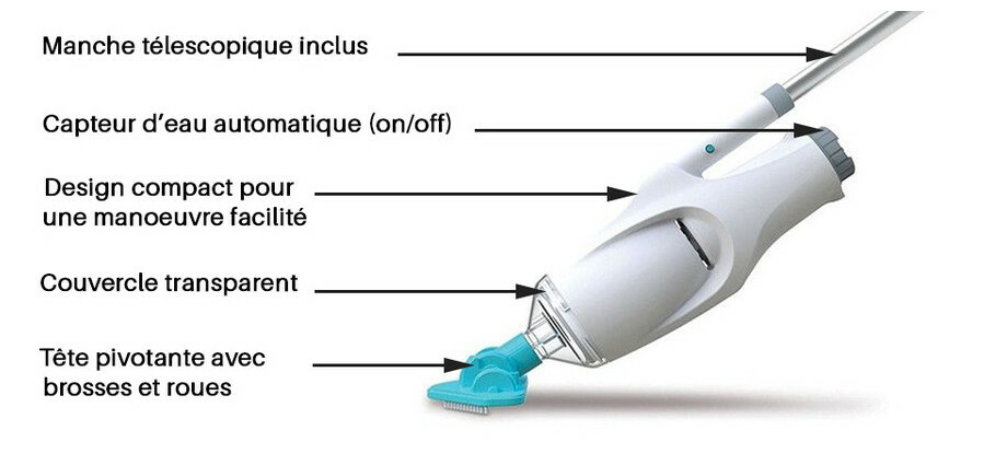 - Son débit d'aspiration 25l/min permet d'aspirer efficacement les débris et autres saletés du bassin.